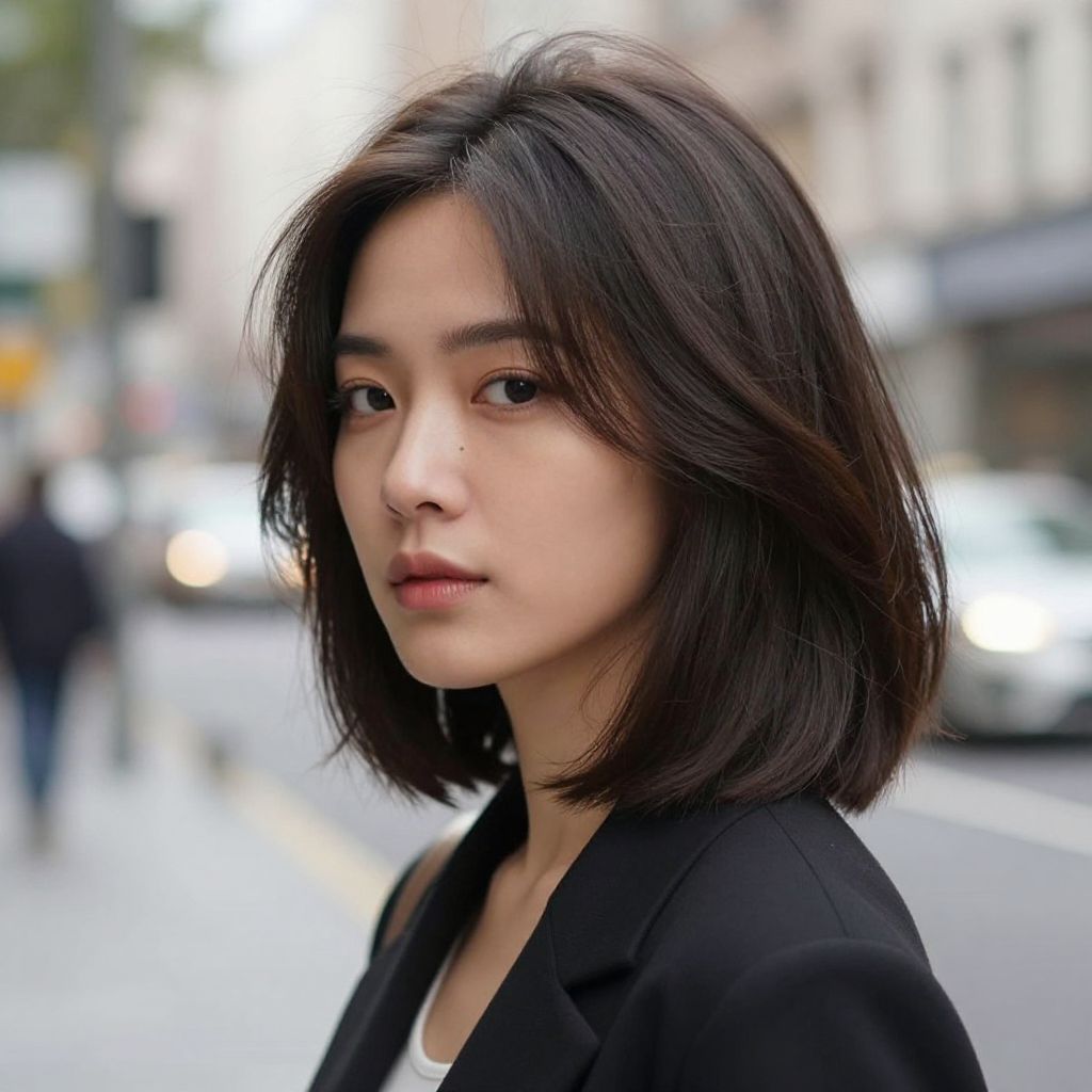 Woman with soft layered bob hairstyle, modern and effortless, glowing natural lighting, urban street setting, soft bokeh background, elegant and flattering on various face shapes, polished yet relaxed, medium to long hair styled with subtle volume and texture, daytime outdoor scene
