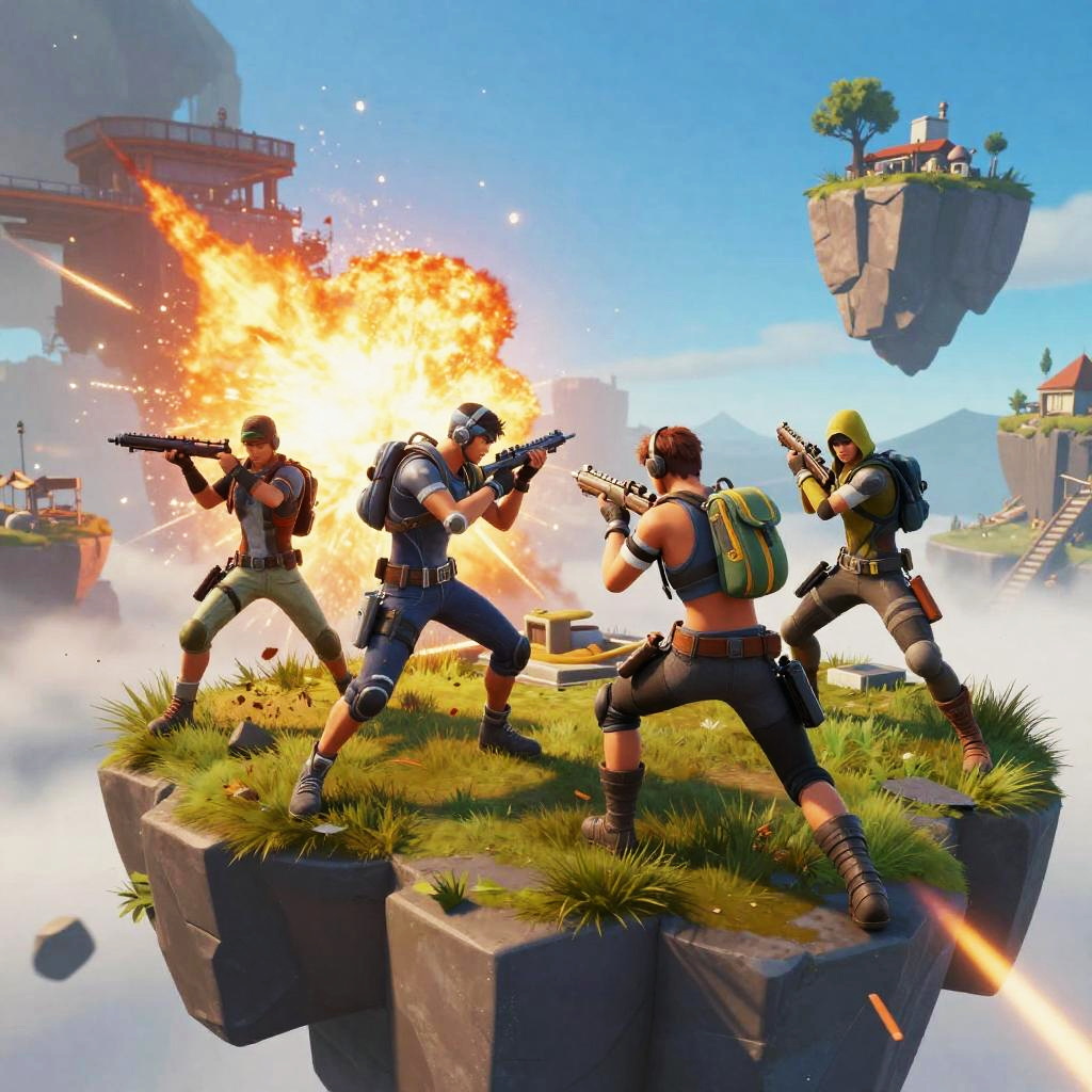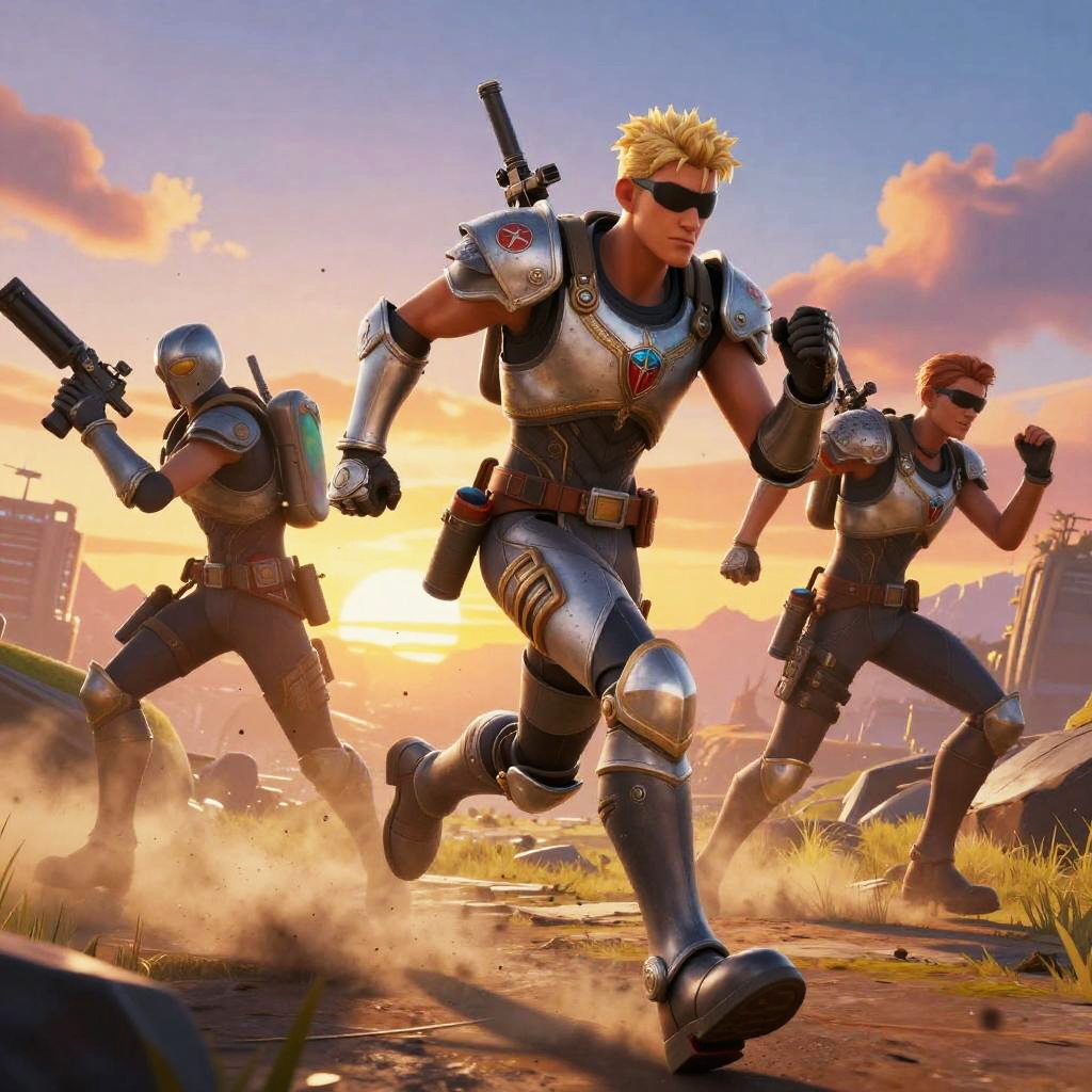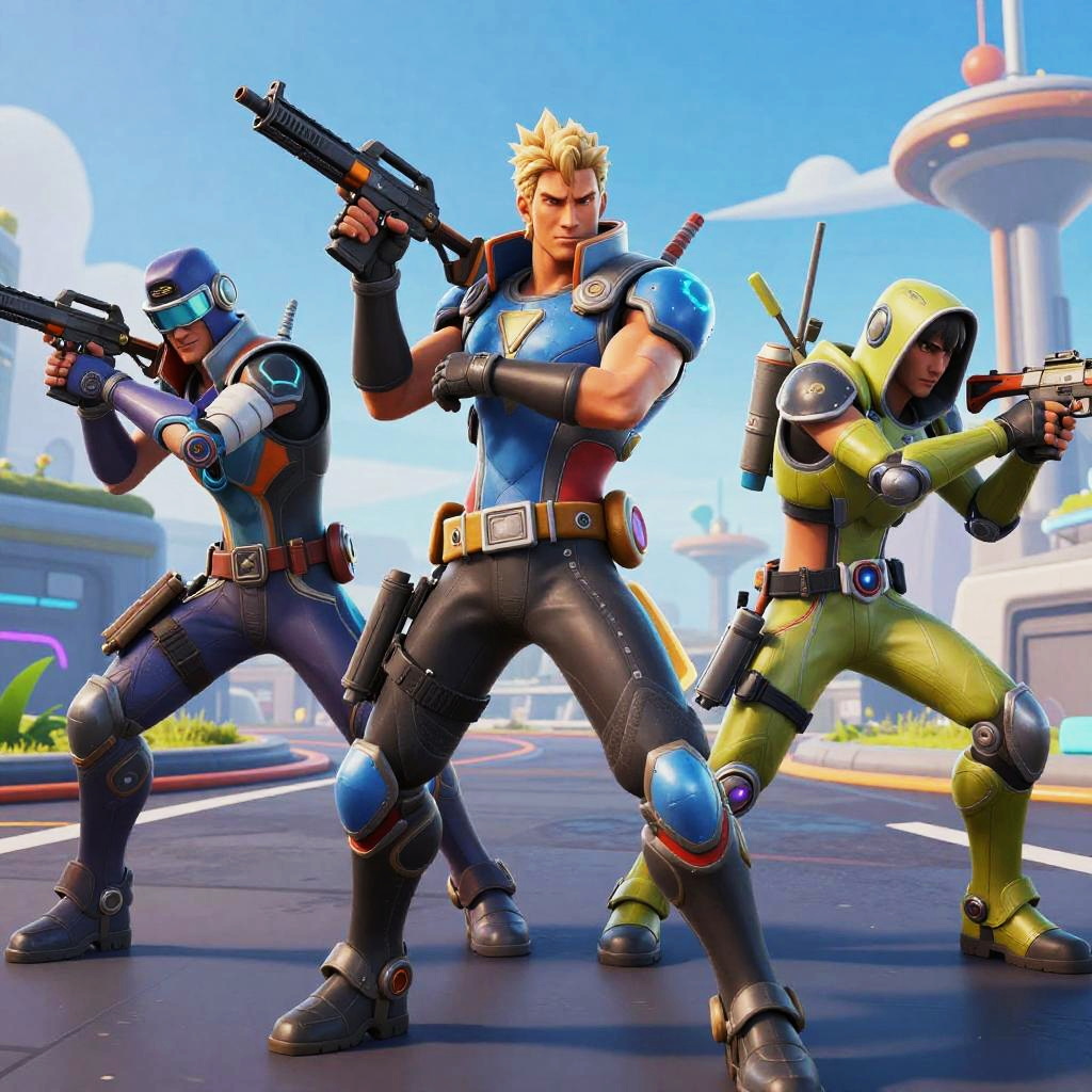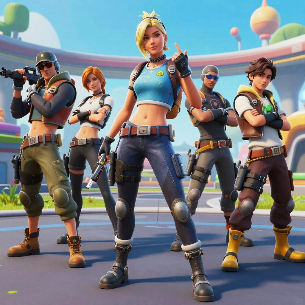 Fortnite characters default skins in a colorful digital arena, vivid lighting, detailed textures on costumes, energetic and diverse poses, cinematic composition with enhanced realism