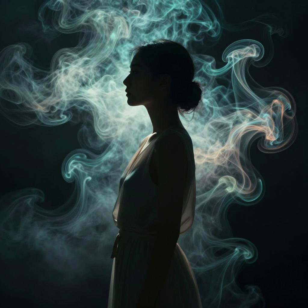 Realistic photo.Artistic portrait of a silhouette in profile, surrounded by swirling, ethereal clouds of teal smoke. The soft, colorful smoke forms abstract shapes around the subject, creating a dreamy, surreal atmosphere. The subject is dressed in a simple, elegant draped fabric, with lighting that accentuates their silhouette against a dark, contrasting background. realistic photo