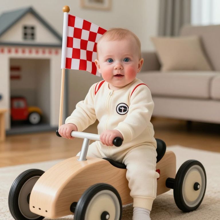 A detailed realistic photo of an infant in a handmade infant racing suit with tiny racing numbers on the chest, the baby has delicate features, rosy cheeks, and bright blue eyes, sitting on a handmade wooden race car with a red racing flag behind, set in a cozy home living room with a toy garage background, soft natural light.