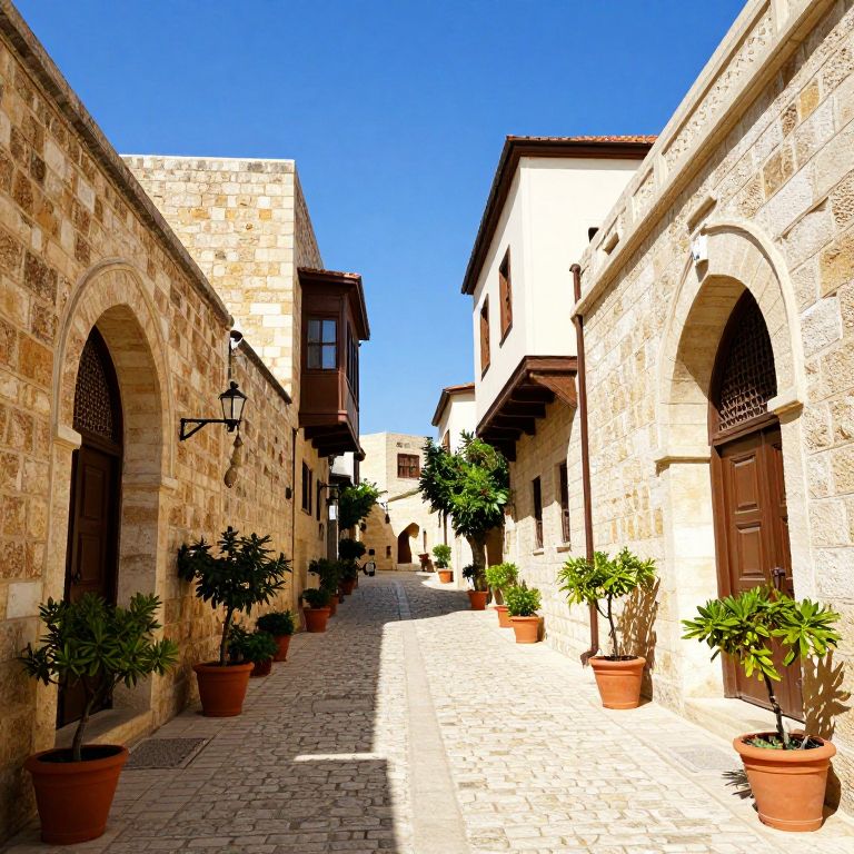 Cobbled streets wind through the charming Old City of Safed, flanked by stone buildings with arched doorways, vibrant potted plants, and terracotta pots lining the pathway under a clear blue sky.