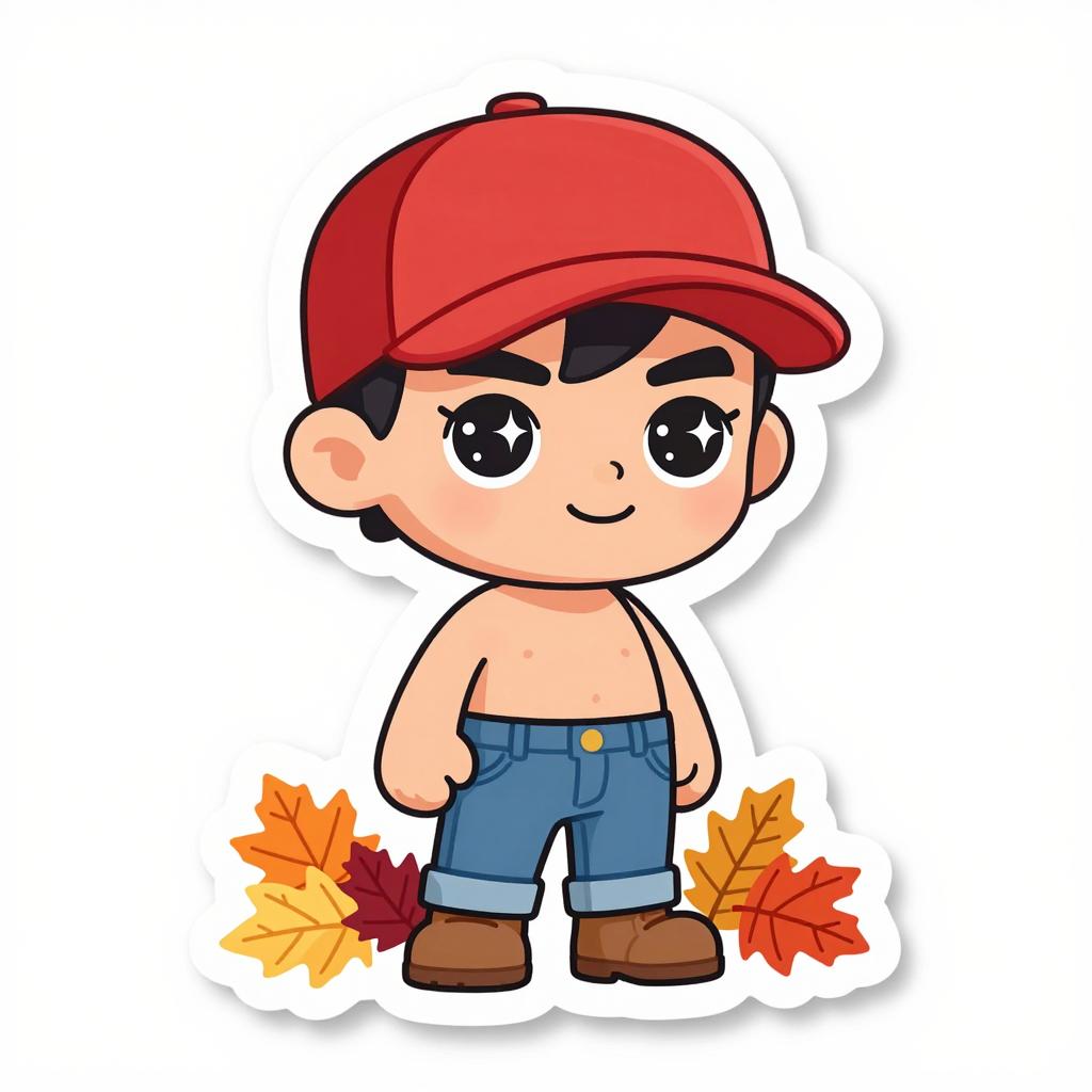 Cel-shaded minimalism full-body sticker of tan-skinned boy with short spiky hair and a red baseball cap wearing denim jeans and boots in cozy autumn forest with colorful fallen leaves, white background, transparent PNG, neon highlights, upscaled, big sparkling eyes, cute smiling face