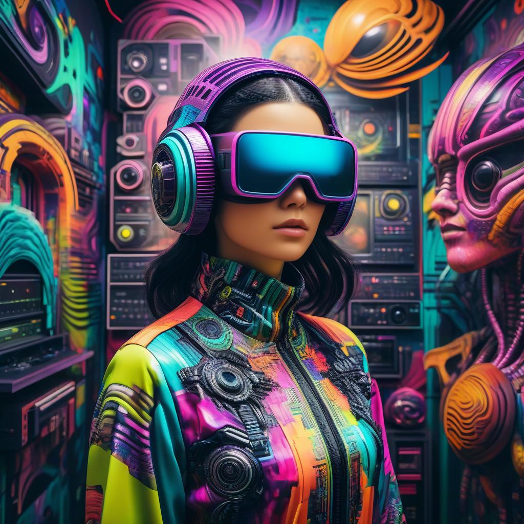 A digital artist wearing a vibrant, multicolored jumpsuit and augmented reality glasses stands in a creative studio filled with psychedelic murals and interactive digital installations, inspired by HR Giger and retro aesthetics.
