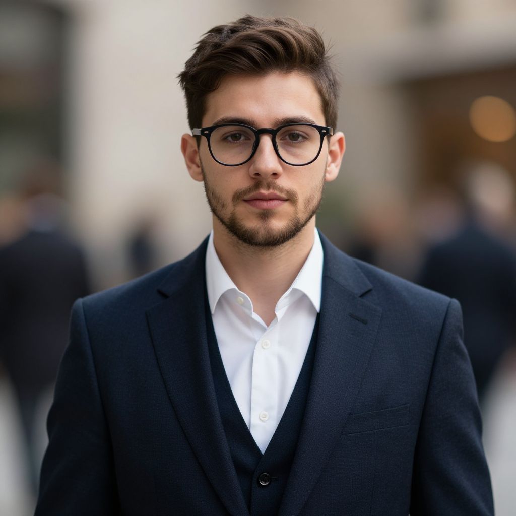 Photograph of a young Caucasian man with fair skin and dark brown hair styled in a neat, slightly swept-back manner. He has a trimmed beard and wears large, black-rimmed glasses. He is dressed in a dark navy blue three-piece suit with a white dress shirt, buttoned up. The background is blurred, showing indistinct figures and a cityscape with buildings, suggesting an urban setting. The man's expression is neutral, with a slight, closed-mouth smile. The lighting is natural, highlighting his face and attire.