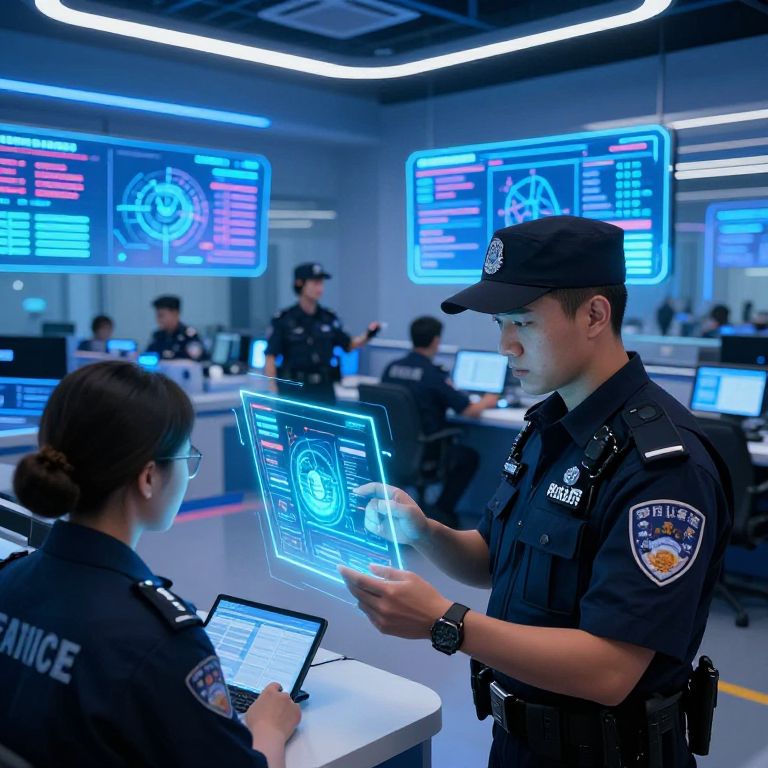 AI prompt photo police: A modern police precinct with augmented reality interfaces, AI-driven analytics dashboards, and officers using smart devices to analyze digital evidence, neon-lit interior with holographic displays, mid-journey style, realistic rendering, high detail, sharp focus.