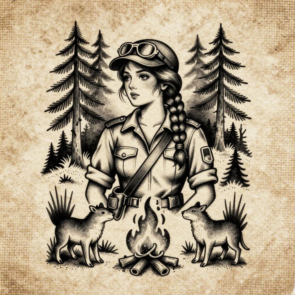 Monochrome ink illustration in a vintage tattoo flash aesthetic featuring female forest ranger with braided ponytail and leather gloves, framed by pine trees above, woodland animals on sides, and campfire below. Printed on weathered burlap texture, with crisp linework, stippling and crosshatching, bold negative space, subtle vignette, museum-print finish, high contrast, fine detail, gritty yet elegant mood.