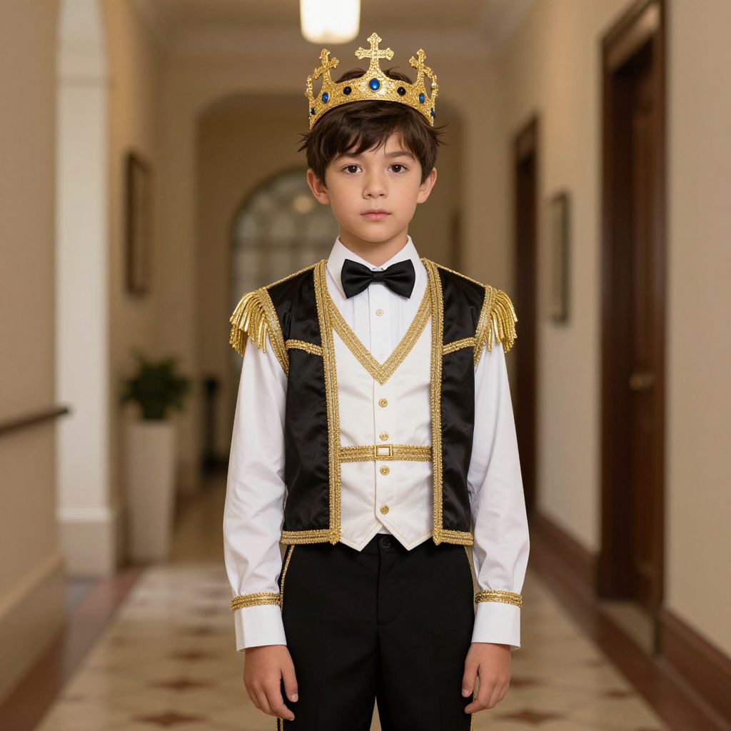 Photograph of a young boy standing in a hallway. He wears a black and white formal outfit with gold trim and epaulettes, a black bow tie, and a gold crown with intricate designs on his head. His dark brown hair is slightly tousled. The hallway has beige walls, wooden doors, and patterned tile flooring. A potted plant is visible in the background to the left, and a window with arched top is seen further back. The boy's expression is neutral, and he stands centered in the frame. The lighting is soft, creating a warm atmosphere.
