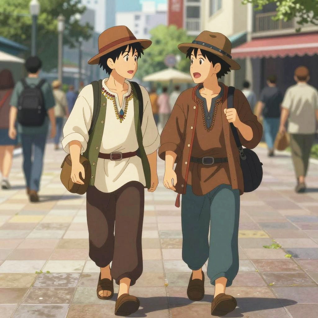 A pair of dancers, wearing elegant evening wear, walking through a softly lit traditional dance hall, expressing graceful harmony, depicted in the nostalgic and realistic anime style of Kei Toume.