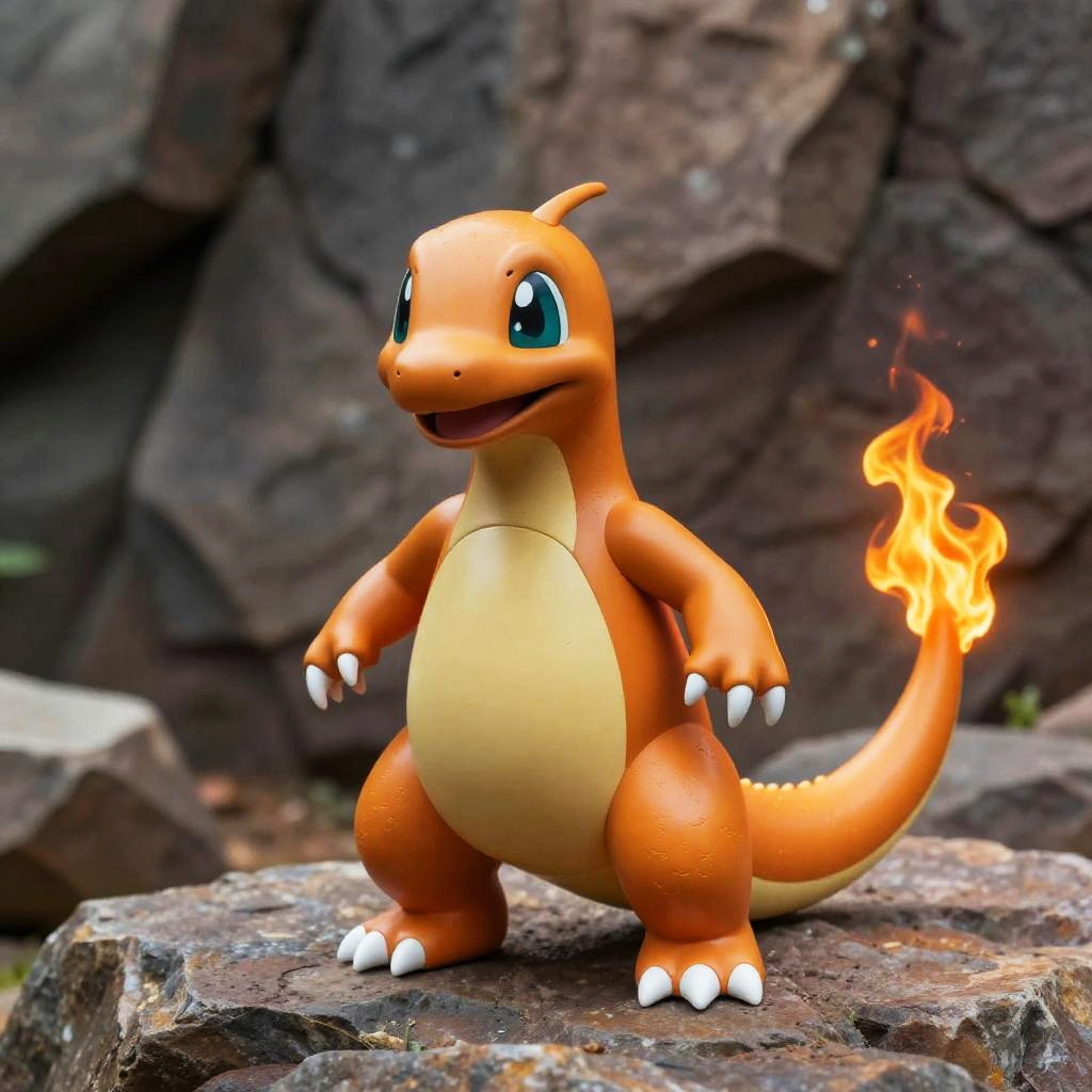 Charmander realistic, a small dragon-like creature with textured skin, ember flame burning at tail tip, standing on a rocky terrain, photorealistic lighting, vivid colors, detailed anatomy