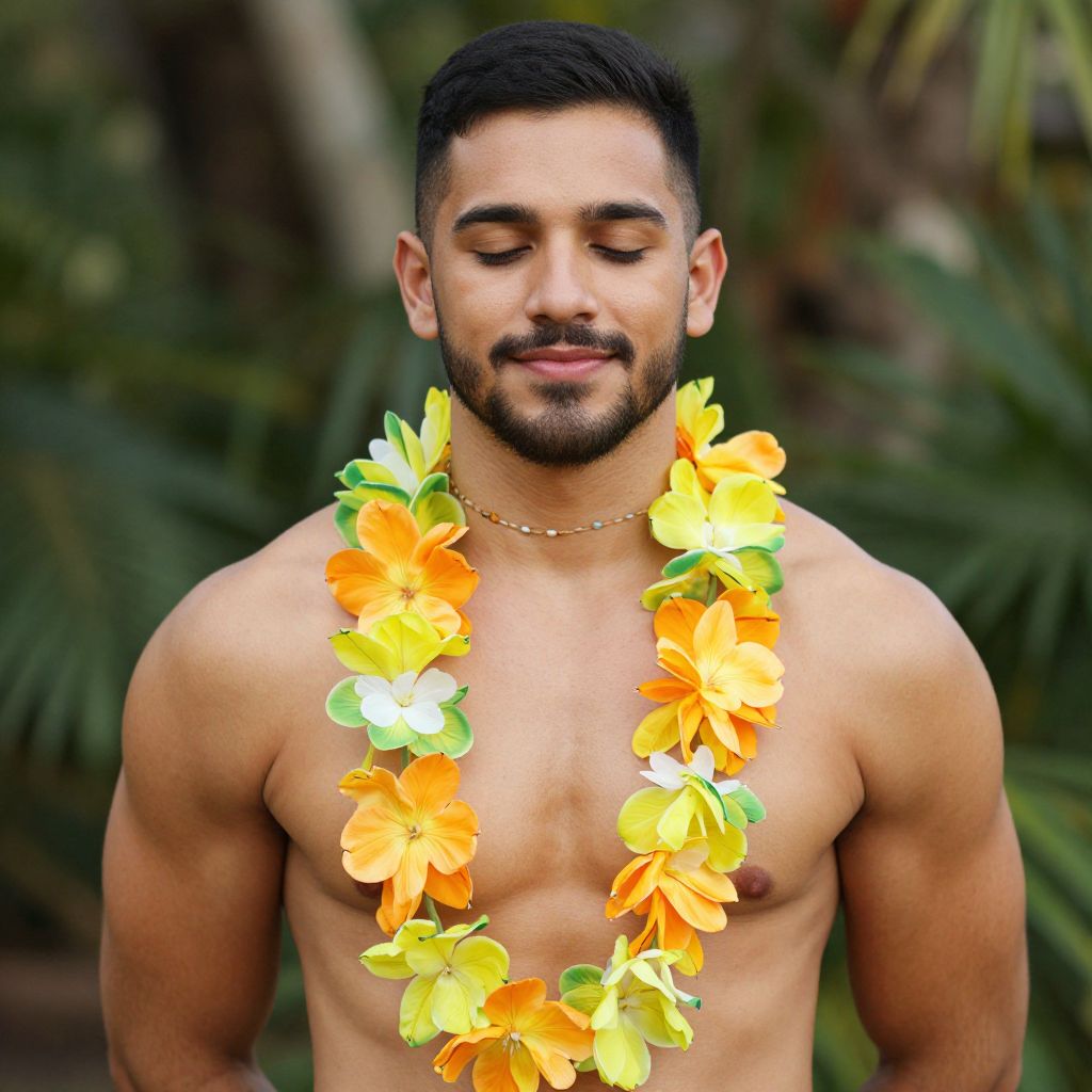 Photograph of a shirtless, muscular, tan-skinned man with short black hair and a trimmed beard, wearing a vibrant yellow and orange hibiscus flower lei around his neck. He has a subtle smile with closed eyes, and a gold necklace. The background is blurred greenery, suggesting an outdoor, tropical setting. The man's well-defined chest and arms are visible, with the lei adding a colorful, festive touch. The image has a natural, bright lighting.