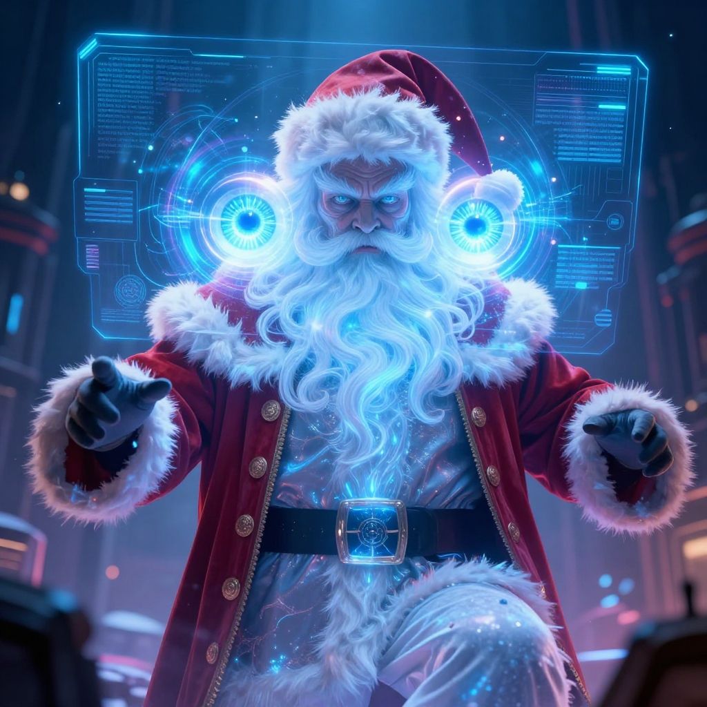 Photograph of a digitally enhanced Santa Claus standing in a futuristic, dimly lit room. Santa, with a white, glowing, voluminous beard and mustache, wears a red velvet coat with white fur trim and black gloves. His eyes are glowing blue, matching the two blue, circular holographic lights behind his head. He has a black belt with a silver buckle and white pants. His hands are raised, fingers slightly curled, emitting a blue light. The background features blurred, dark structures with neon lights, adding a sci-fi atmosphere. The image combines traditional Christmas elements with futuristic technology.