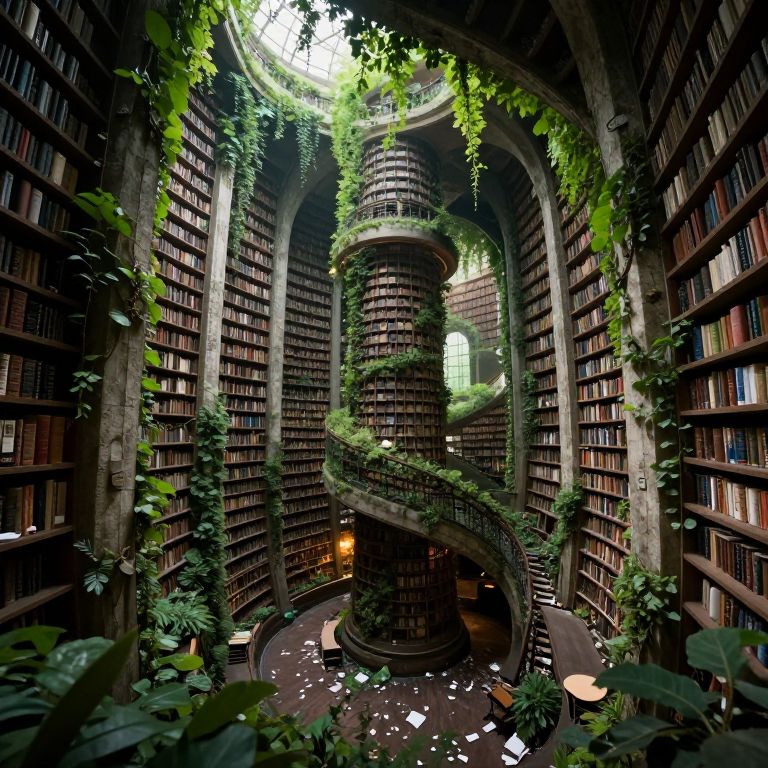 Photograph of a lush, towering library with spiral staircase of books, vines, and greenery, illuminated by natural light from skylight.