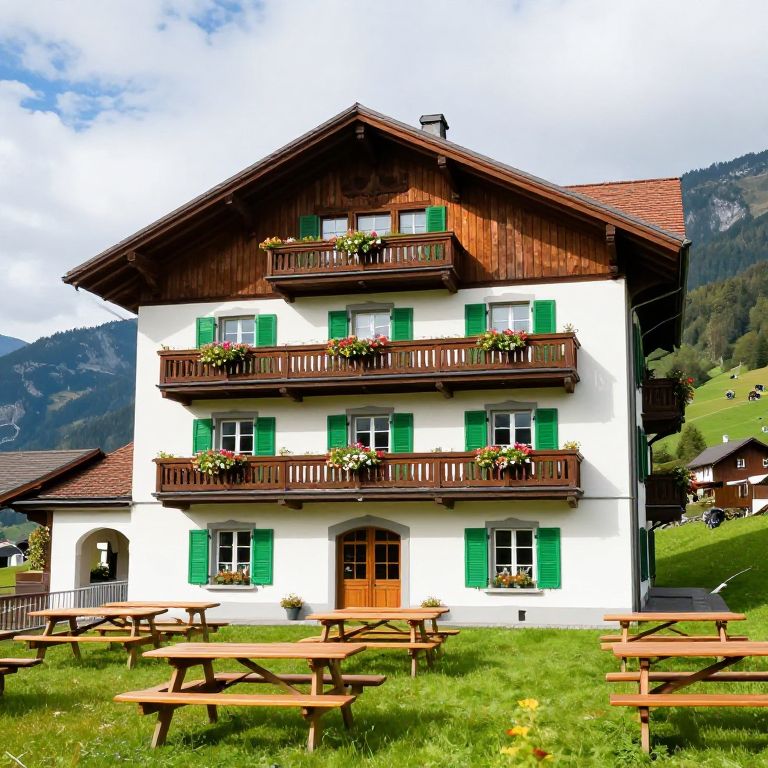 Imposing Palace Hotel in Gstaad showcases a three-story alpine structure with vibrant green shutters, terracotta roof, and balconies adorned with floral arrangements, surrounded by neatly arranged wooden picnic tables on a lush green lawn under open skies and mountainous backdrops.