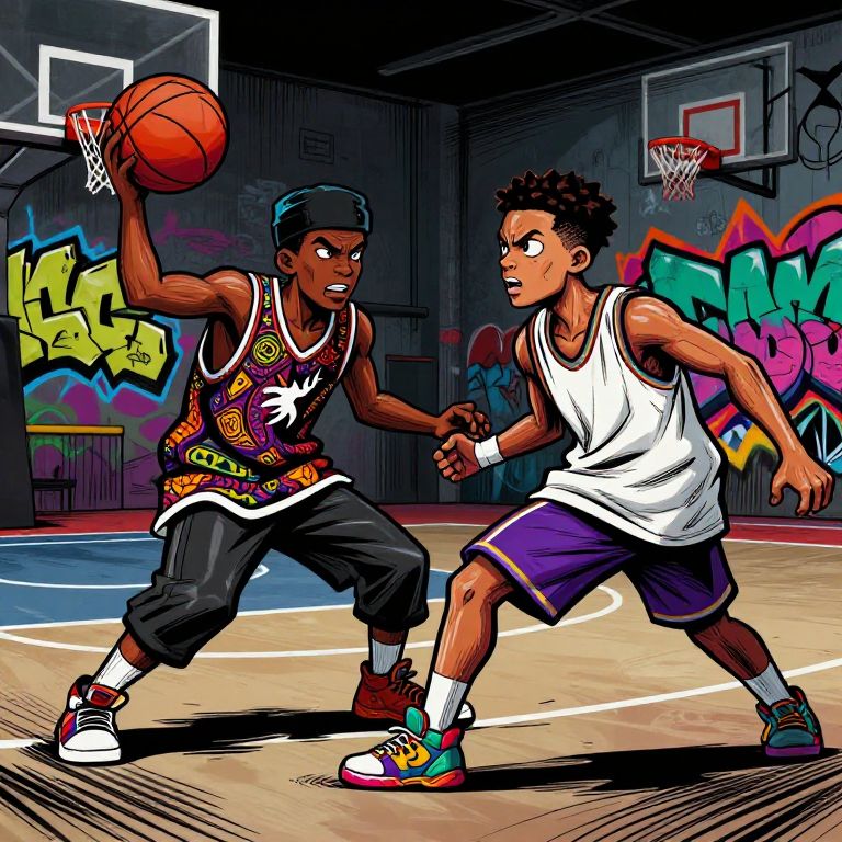 Ghetto cartoon drawings showcasing a basketball court battle, intense expressions, bold motion lines, colorful streetwear with intricate patterns, graffiti murals in the background, energetic poses mid-action, vibrant palette with deep contrasts, capturing urban youth culture and competition.