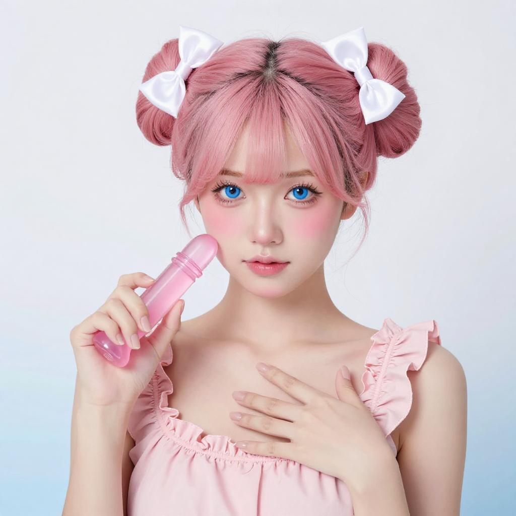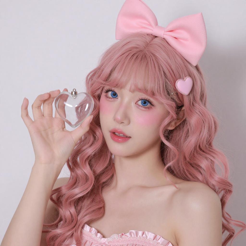 Photograph of a young woman with pastel pink hair styled in twin buns, adorned with white bows. She has blue eyes, fair skin, and wears a pink, ruffled top. She holds a clear, heart-shaped object near her mouth, with a playful expression. The background is a plain, light gray.