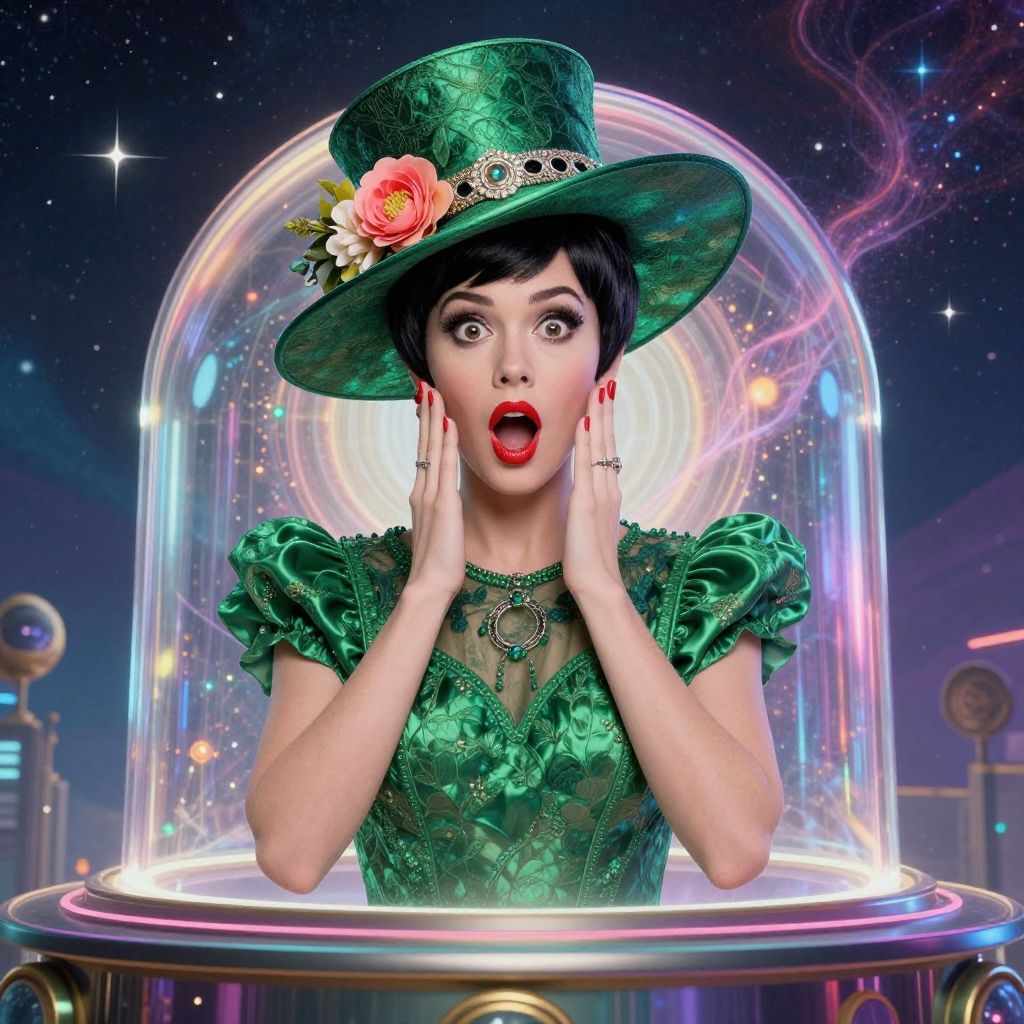 ((masterpiece, best quality, highres, realistic)) Perfect Face, wrenchrococodome, hat, hat ornament, Forest Green color dress, pixie cut, surprise, hat flower, full body, . retro aesthetic, cyberpunk, vibrant, neon colors, vintage 80s and 90s style, highly detailed . magnificent, celestial, ethereal, painterly, epic, majestic, magical, fantasy art, cover art, dreamy . elegant, sophisticated, high-end, luxurious, professional, highly detailed