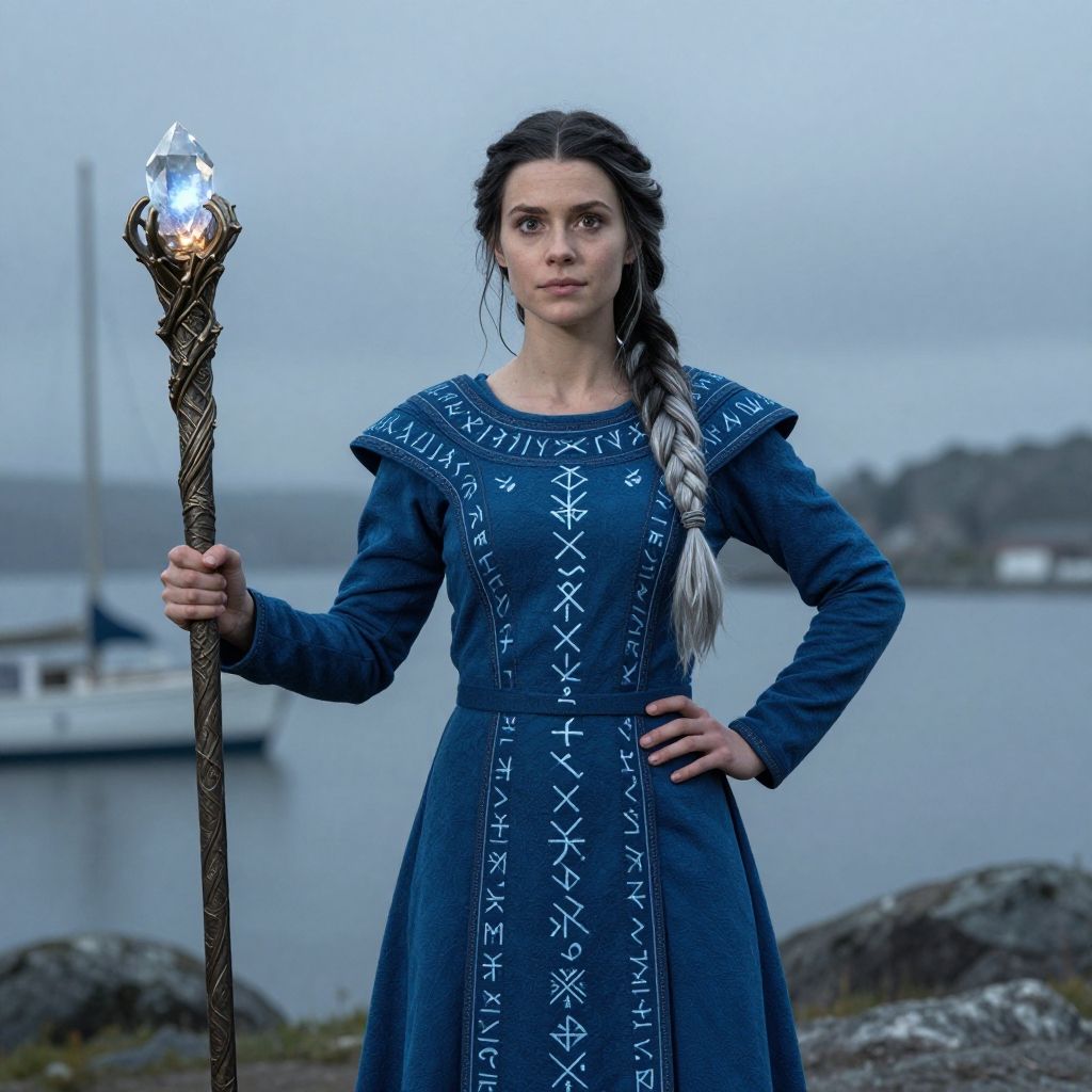 Photograph of a young woman with fair skin and dark brown hair in a long braid, standing outdoors by a calm lake. She wears a blue, long-sleeved, medieval-style dress with white, runic-like embroidery. She holds a tall, ornate staff with a glowing, crystal-like top in her right hand. Her expression is serious, and she stands with her left hand on her hip. In the blurry background, there's a white boat on the lake and a distant, tree-covered shoreline. The sky is overcast, adding a moody, blue-gray tone to the scene.