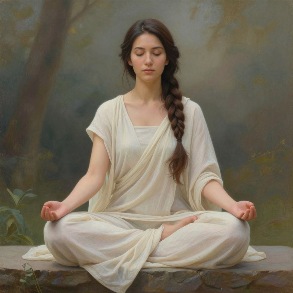 In this serene painting, a woman is depicted meditating in a tranquil outdoor setting. She sits cross-legged on a stone ledge, her body relaxed and poised in a state of deep contemplation. Her attire is a flowing, light-colored garment that drapes elegantly over her form, adding a sense of grace and tranquility to her posture. The woman's hair is styled in intricate braids, cascading down her back in soft, flowing strands.