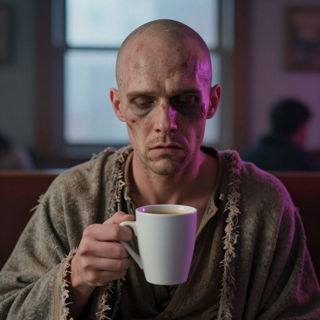 In this highly detailed and photorealistic image, a disfigured man with a melted plastic face and scarred features holds a cup of coffee, exuding a sense of sadness and shyness. His attire, a tattered and stained robe, adds to the overall grim and somber atmosphere. The lighting is a blend of vibrant and soft hues, creating a dramatic effect with volumetric lighting that highlights the textures and contours of his face. The background, though blurred, suggests an indoor setting with a window and another person, adding depth to the scene. The cinematic composition, with its wide shot and first-person perspective, draws the viewer into the man's world, emphasizing the emotional weight of his disfigurement. The image is rendered with high resolution, showcasing the intricate details of the man's face, clothing, and the surrounding environment, all rendered with the precision of hyperrealism.