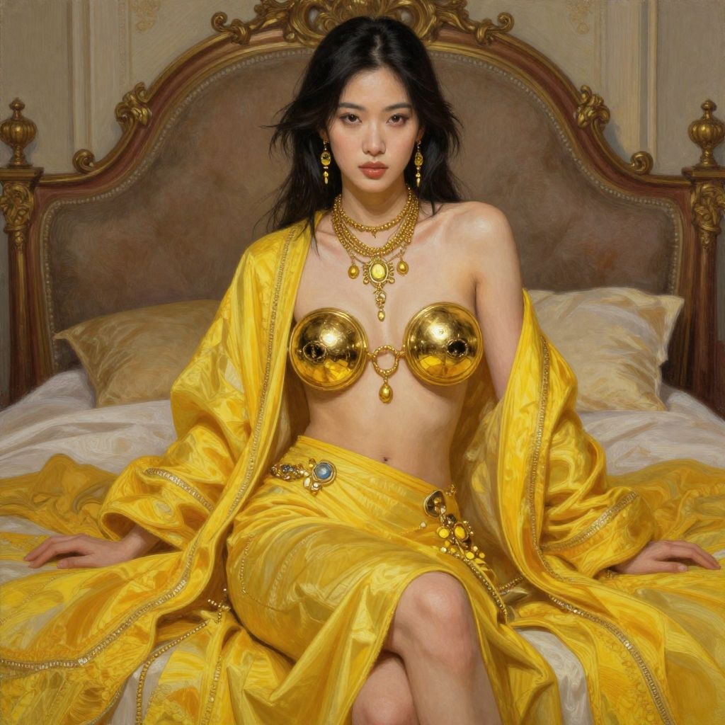 A digital painting of an Asian woman with long black hair, sitting on a luxurious bed with an ornate wooden headboard. She wears a golden, sheer, open robe with matching yellow fabric draped over her lap, revealing golden, circular, metallic breast plates. She accessorizes with multiple gold necklaces and earrings. Her skin is fair, her expression is calm, and she sits with her legs slightly apart. The bed has cream-colored pillows and a yellow bedspread. The background features subtle, elegant wallpaper. The image has a rich, opulent, and slightly surreal aesthetic.