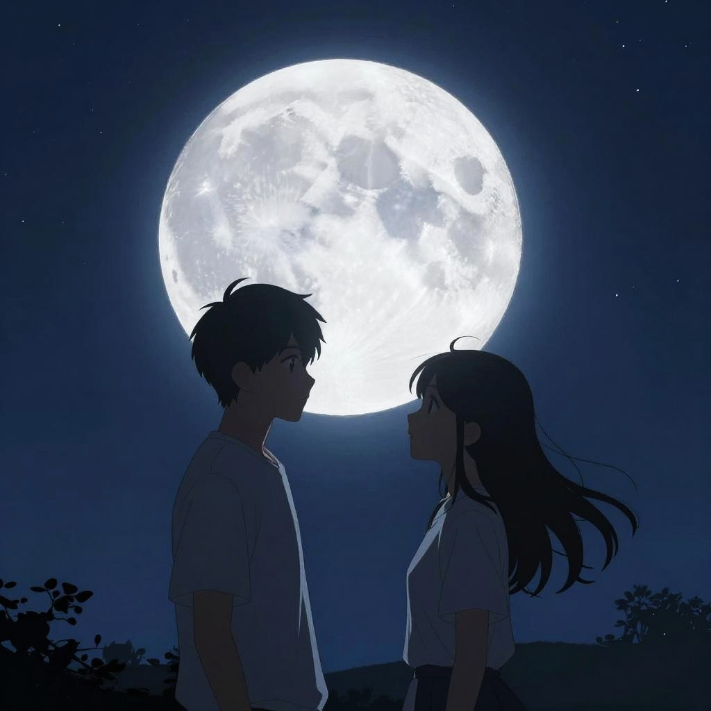 This digital anime-style illustration depicts a silhouetted couple standing close, about to kiss, under a twilight sky. The woman, with long hair, wears a flowing dress, while the man, with short hair, wears a shirt and pants. The background features a vibrant sunset with orange and pink hues, transitioning to a deep blue night sky, dotted with stars and a crescent moon. Clouds are scattered across the sky, and the couple is surrounded by tall grass in the foreground. The image captures a romantic, dreamy atmosphere with soft, glowing colors and delicate details.