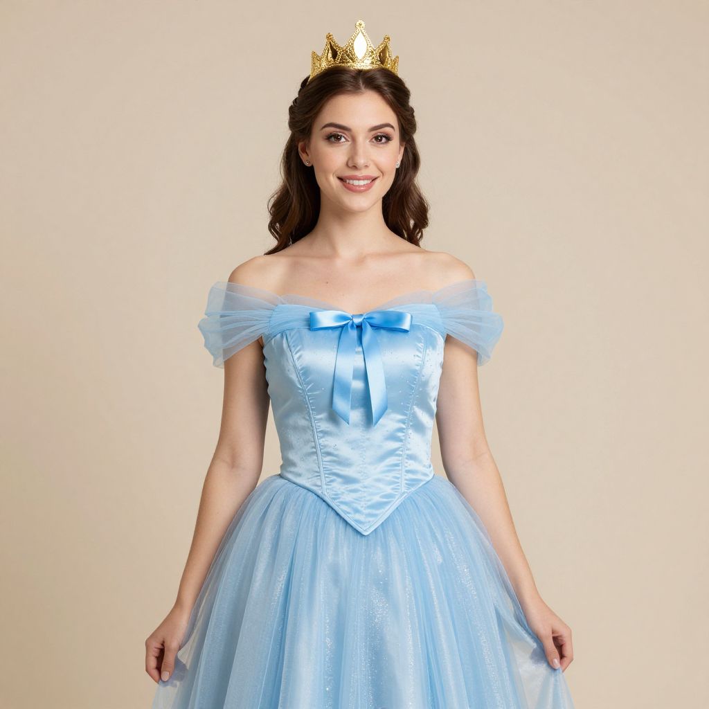 Princess Elena Costume Adult, woman in a blue dress with a tiable and a gold crown