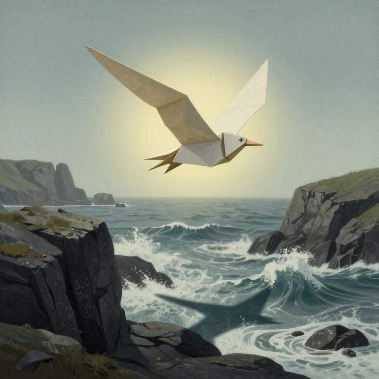 A surreal seascape unfolds with an origami-like creature soaring above turbulent waves in a rugged Scottish landscape. From a unique perspective, the bird's delicate, paper-thin form casts elongated shadows over jagged rocks as it glides soundlessly through the air. Bathed in a soft, otherworldly light emanating from within its being, this scene evokes a sense of wonder and mystery, inviting viewers to explore nature's hidden realms. Rendered in an enigmatic style reminiscent of Magritte, with intricate details and subtle juxtapositions that challenge perception, this image captures the essence of both beauty and enigma inherent in our natural world.