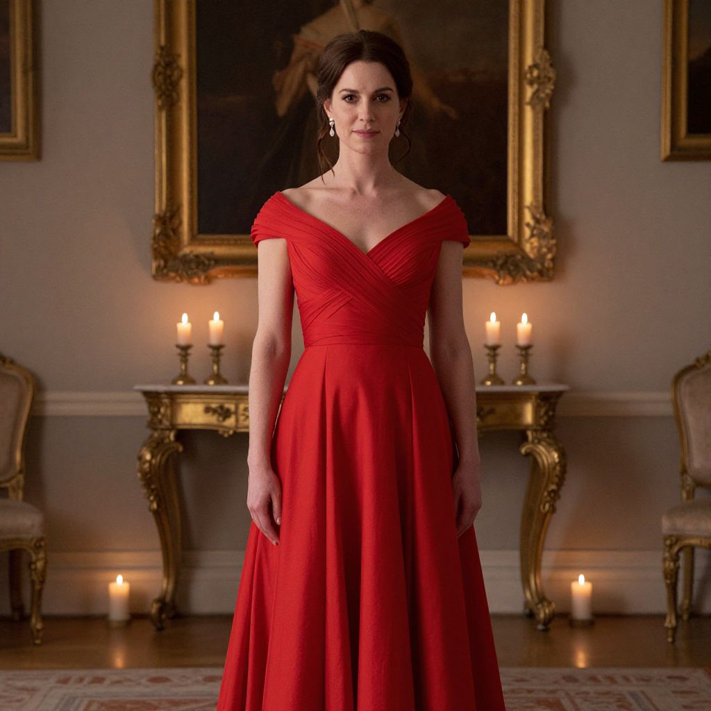 Photograph of a tall, slender woman with fair skin and dark brown hair, styled in an elegant updo. She wears a striking, off-the-shoulder, red evening gown with a fitted bodice and a flowing skirt. She stands in a luxurious room with soft, warm lighting. Behind her, a gold-framed painting hangs on a beige wall, flanked by two ornate, gold-trimmed tables with candles. Two upholstered chairs with beige fabric are on either side of the tables. The floor is wooden, partially covered by a patterned rug. The woman's makeup is subtle, with red lipstick complementing her dress.