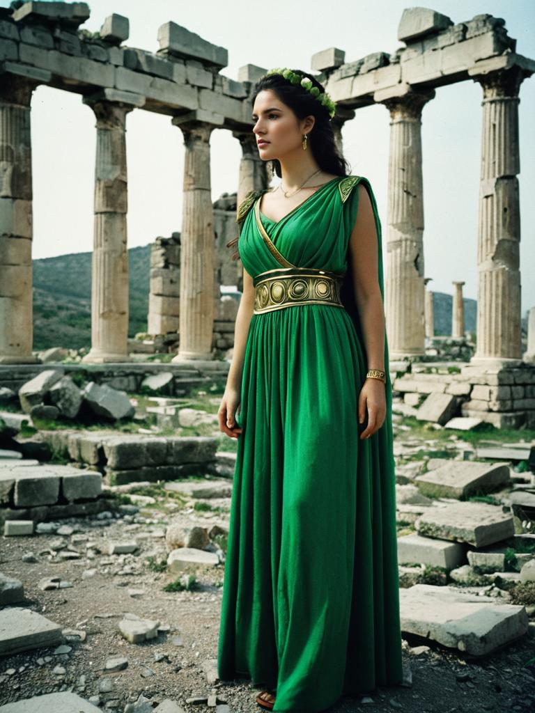 Woman in Green Greek Goddess Costume, photorealistic outdoor portrait among ruins