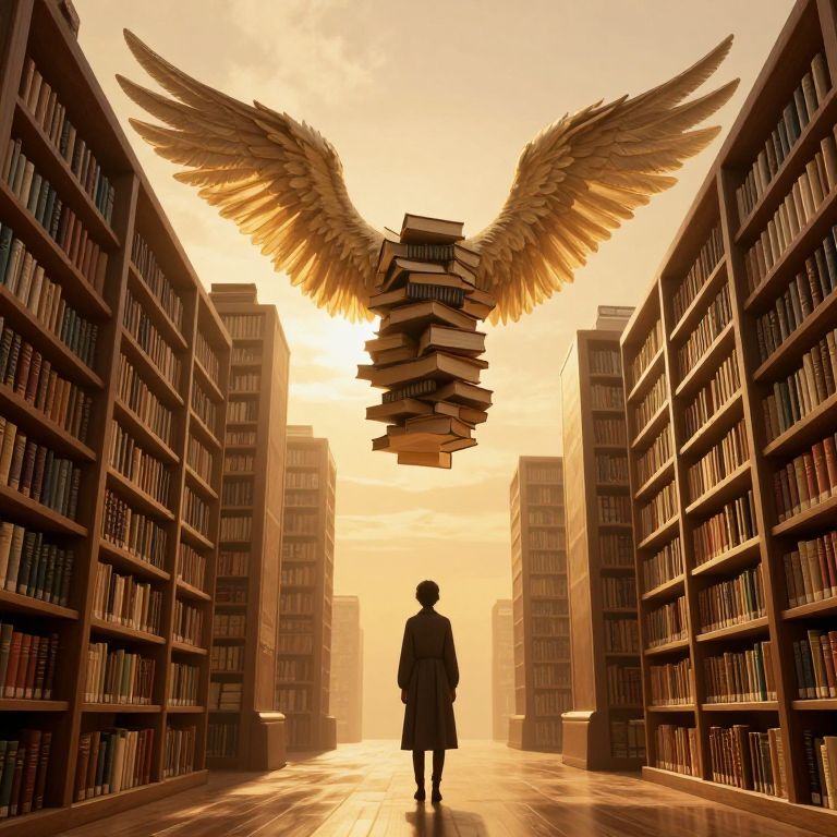 A digital illustration features a silhouetted figure in a long coat standing at the center of a vast library with towering bookshelves on both sides. The figure faces a bright, golden sunset, illuminating large, majestic angel wings emerging from the ceiling. The wings are adorned with numerous stacked books, glowing with the sun's light. The floor is reflective, and the bookshelves are filled with neatly arranged books. The overall atmosphere is ethereal and mystical, with a warm, golden color palette dominating the scene.