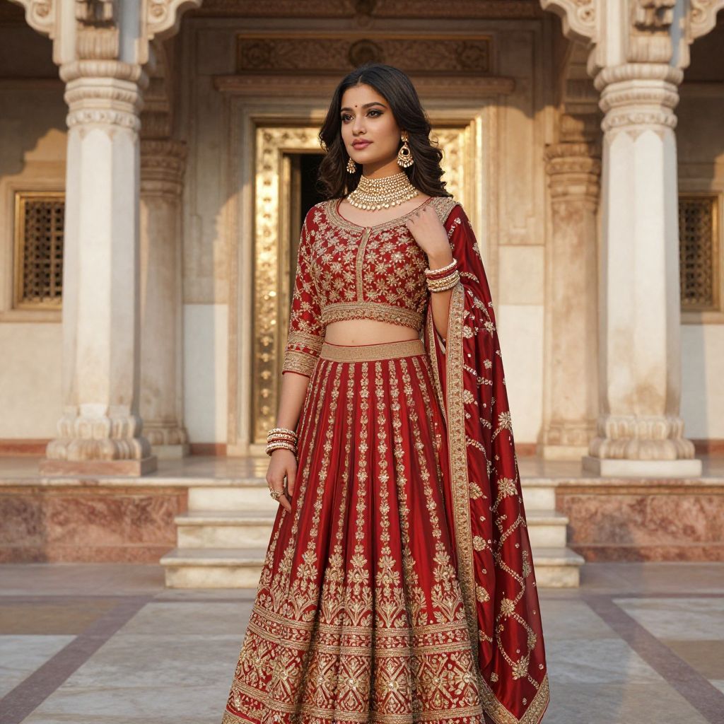 A model of South Asian descent, with a porcelain complexion, dark wavy hair, and a serene expression, wearing a traditional shivshahi paithani costume with red and gold zari work, standing in front of a marble temple in Aurangabad, with early morning sunlight reflecting off the pillars and temple doors.