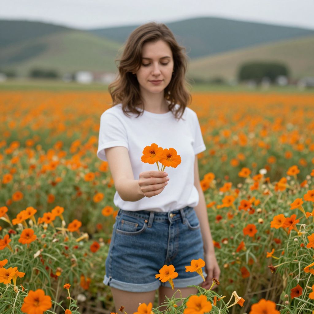 Woman standing amidst a vibrant field of orange nasturtiums, holding two blossoms in her hand, captured in a serene outdoor setting with rolling hills in the background.