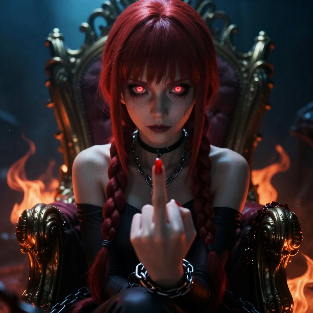 (midriff), middle_finger, (makima:1.2) close up, (makima_eye:1.2), (glowing_eye:1.2), scary, detailed_eyes, ((face_focus, zoomed_face, zoomed_in, bokeh, underwater, water, wet_surface)) ((face_portrait:1.2)), (duality_style:0.3), (line_style:1), (minimal_gradient:0.7), (nixeu_basic2:0.7), (nixeu_extra:0.7), (nixeu_soft:0.7), (nixeu_white:0.7), (dark_fantasy:1), (flame_surge_style:1), ((sitting on a throne)), bloody, evil, dark, moody, spooky background, villian, colorful, beautiful, braided, (chains), somber expression, looking down, dark energy, vibrant colors, portal to another world, red nail polish, side view, ultra realistic, intricate details, elegant, hyper realistic, tonemapping, hyperfocus, sharp focus, hyperdetailed, intricated detail, shiny, realism, [colorful], [volumetric lighting], photorealistic realistic, luxurious, close_up, 8k, detailed, unreal engine 5, ray tracing, cinematic, depth of field, octane render, realistic lighting, cinematic lighting, small gold particles, best_quality, big smile, oversized jacket, good_anatomy, highly detailed, fit, highres, superb, 8k wallpaper, extremely detailed, intricate, limited palette, smile, (freckles:0.5), small details, ultra detailed, close fists, c_cup, confused, fragance rose, red, black, white, gold, Decapitation of the damned, 3d, 3ds, volumetric lighting, realistic, 4k, depth of field 3d, masterpiece, perfect, award-winning, hyper-detailed, photorealistic, realistic light, unity, hard lighting, stop motion, hyper detailed, zoom out