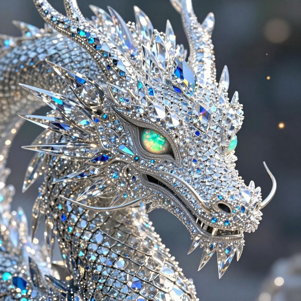 Close-up photograph of a glittering, silver dragon head adorned with blue and green gems, with piercing green eyes, set against a blurred dark background.