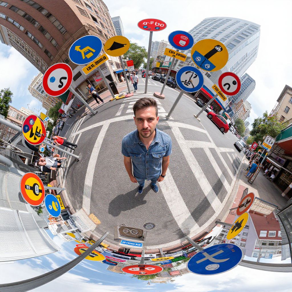 [[man,circle road signs]]Vibrant urban scene: A man stands confidently at the heart of a busy city intersection, surrounded by an array of multicolored circular road signs that seem to swirl around him like a kaleidoscope. The camera captures this dynamic moment from every angle, creating a breathtaking 360-degree panorama that immerses viewers in the energy and activity of Man has masculine face and piercing eyes