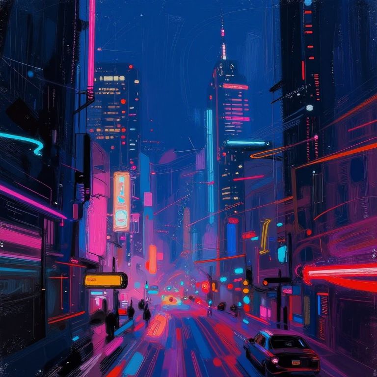 Best art styles for MidJourney combining cyberpunk aesthetics with abstract expressionism, highlighting neon-lit cityscapes, dynamic brush textures, and futuristic elements infused with chaotic, emotional color splashes for immersive sci-fi scenes.