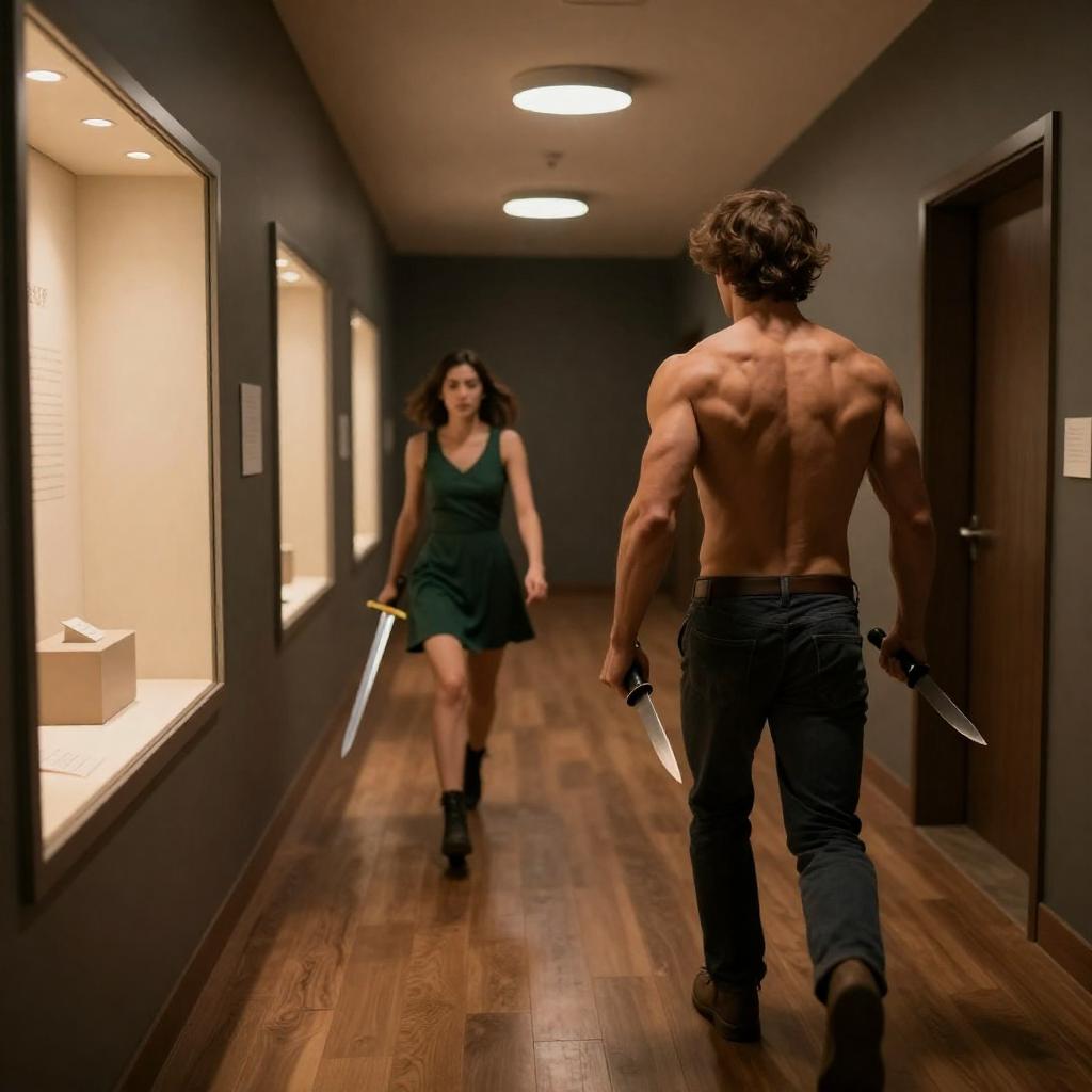 Muscular, shirtless man with brown hair from behind, holding knives, running down wooden hallway. Opposite, woman in green dress with sword, approaching. Hallway has illuminated exhibits on left, darkened rooms on right. Overhead light, warm glow.