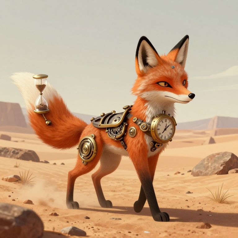 Digital artwork of a red fox with ornate, clockwork armor in a desert, featuring a clock on its tail and chest.