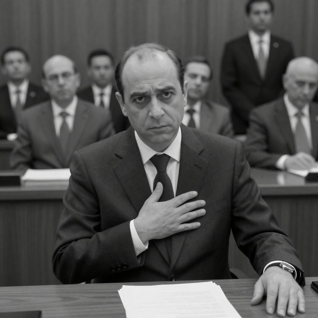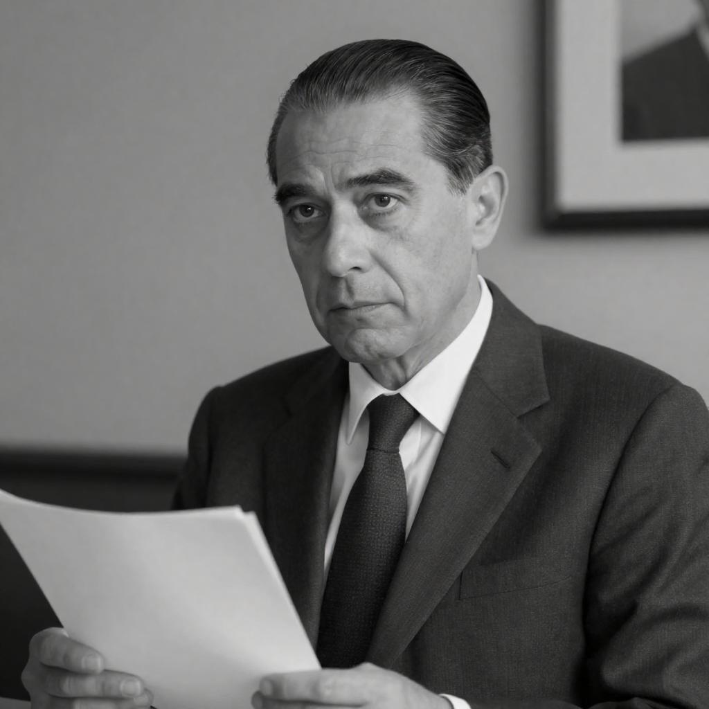 Black and white photograph of a middle-aged man with receding hairline, serious expression, dark suit, white shirt, black tie, sitting at wooden desk, hand on chest, other hand on desk. Background: several men in suits, some seated, some standing, looking forward. Wood-paneled room. Stack of papers on desk.
