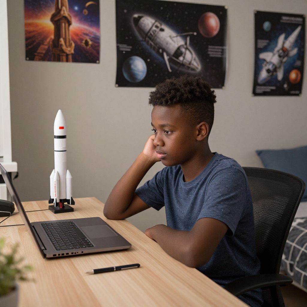 Black 14 year old boy in a cozy bedroom filled with posters of science and space, sitting at a desk with a laptop and model rockets, thoughtful expression, soft indoor lighting, realistic textures and warm tones, contemporary lifestyle portrait.