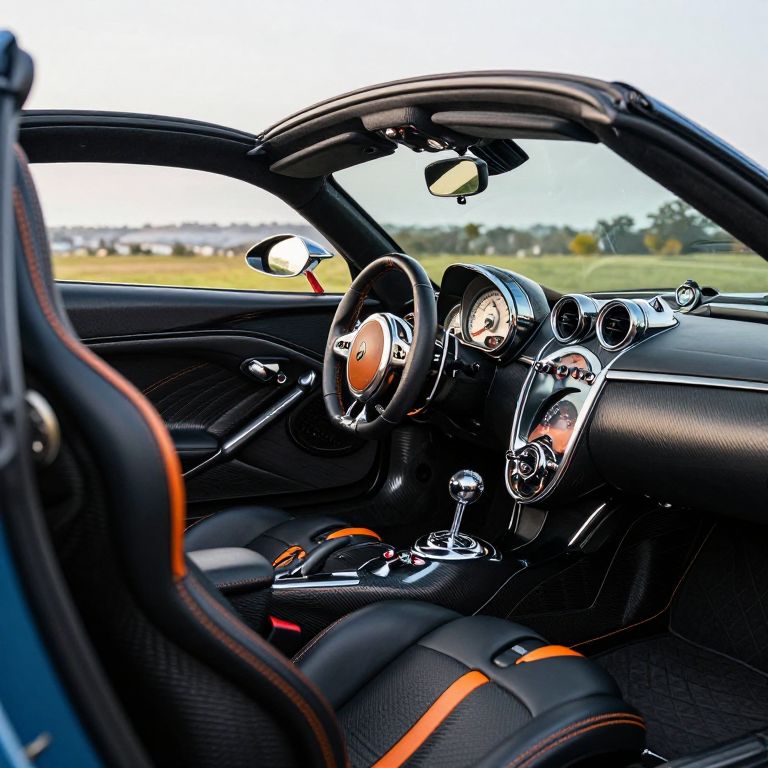 Luxurious interior of the Pagani Huayra showcasing its meticulously crafted black leather seats with vibrant orange stitching, a sleek dashboard featuring circular gauges and a manual gear shifter, and a panoramic view through the open-top design revealing a serene landscape beyond.