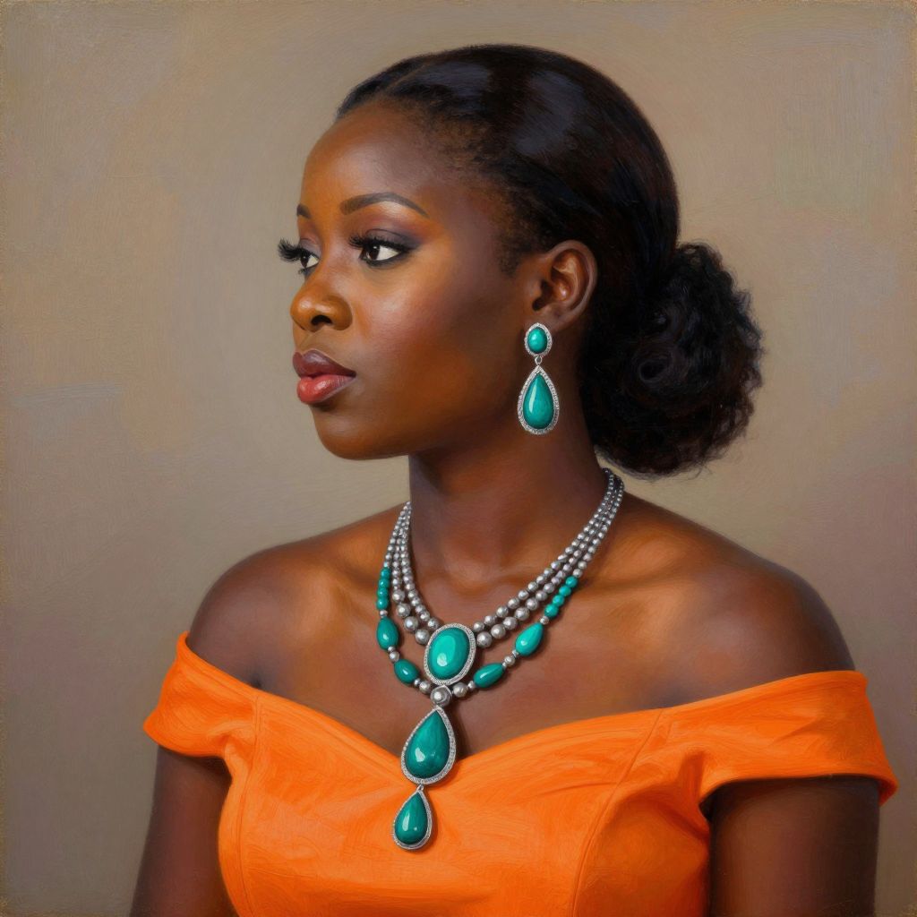 Vibrant oil portrait by Nkolika Anyabolu captures a woman's elegant profile adorned with teal and silver jewelry, featuring a layered necklace with teardrop pendant and matching earrings, complemented by an orange shoulderless top against a neutral background.
