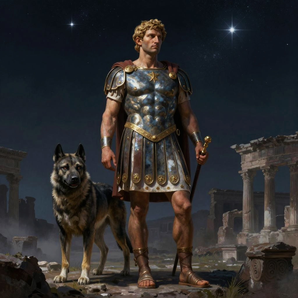 Romulus as a powerful figure in Roman mythology, standing with the she-wolf under a starry night sky, majestic and stoic, with ruins of early Rome faintly visible in the misty background, painted in a dark fantasy style.