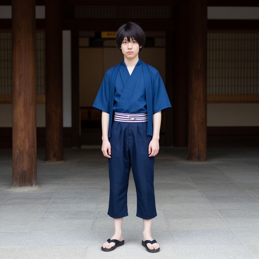 "itadori yuji costume, 1boy, male focus, solo, standing, japanese clothes, full body, architecture, looking at viewer, east asian architecture, sandals Realistic photo of casual sexy person with pretty face"