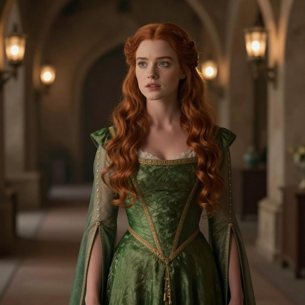 Photorealistic portrait of a young woman with long red wavy hair, fair skin, and serene expression. She is wearing a green medieval-style corset dress with puffed white sleeves and a lace-up front, standing against a blurred stone wall background. The image features soft natural light, an elegant and regal fantasy or historical aesthetic with high detail and a slightly warm color palette.