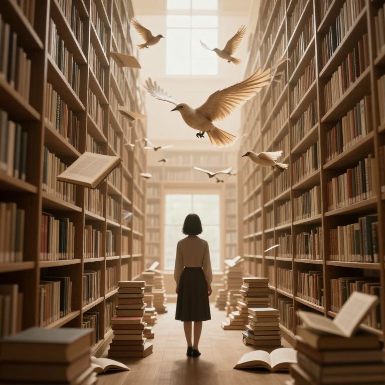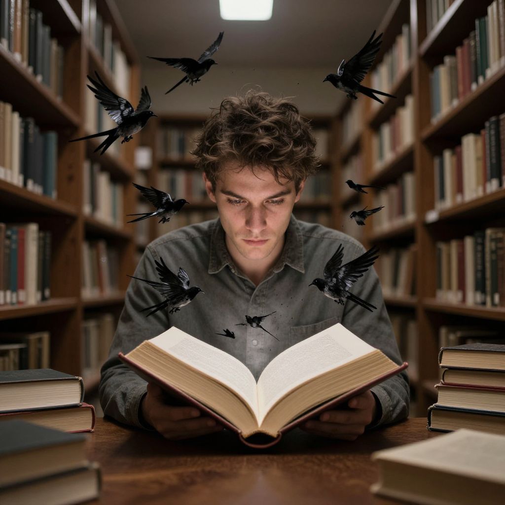 Man engrossed in reading a book as its pages unfold like wings, releasing a flock of ink-black sparrows into the air, surrounded by scattered books and towering shelves in a dimly lit library.
