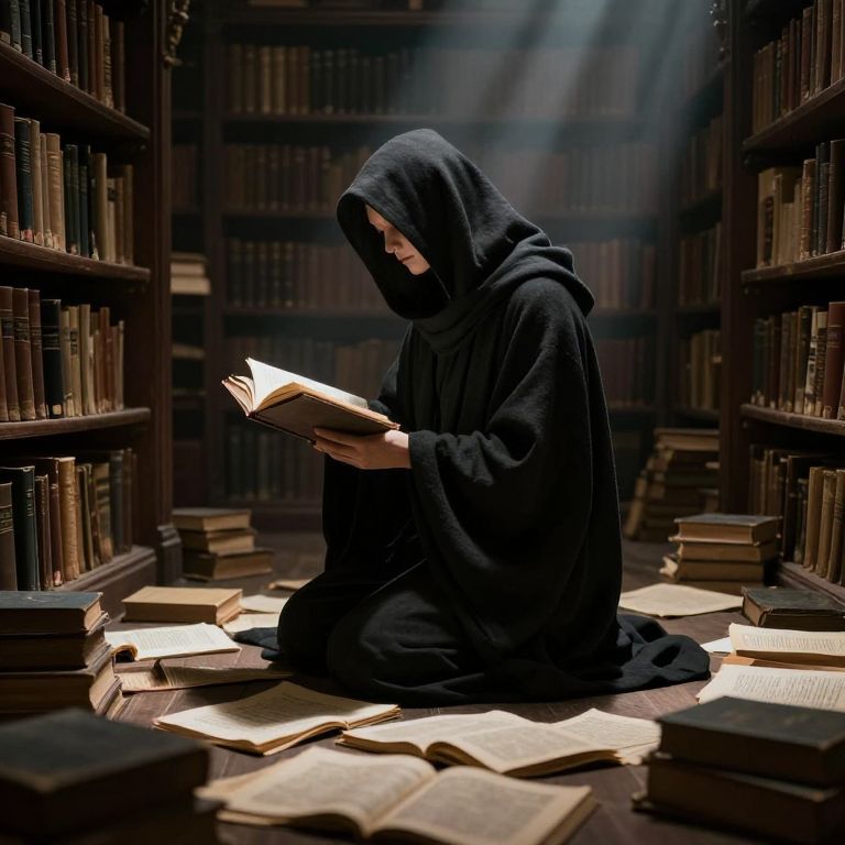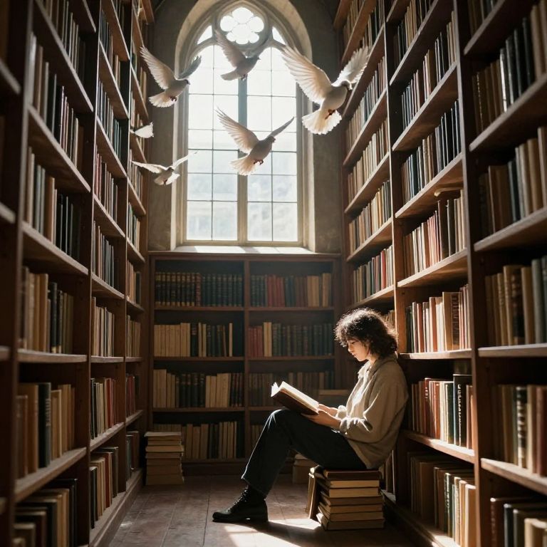 Photograph of a young man with curly brown hair, wearing a dark gray button-up shirt, sitting at a wooden library table, deeply focused on an open book in front of him. Black silhouetted birds fly around his head, creating a mystical effect. The background features tall, wooden bookshelves filled with books, creating a narrow aisle. Two closed books are positioned on either side of the open book, adding to the scholarly setting. The image is brightly lit with a focused light source above, highlighting the man and his book.
