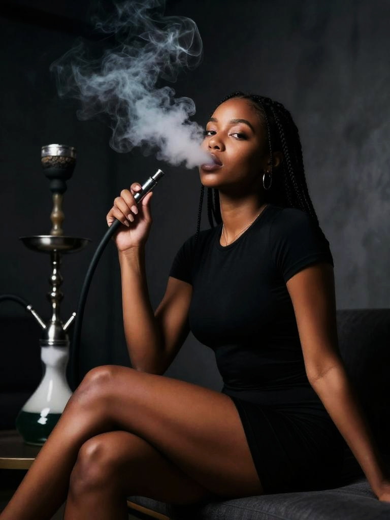 Woman smoking shisha, moody night interior, medium-brown-skinned woman with braided hair and confident gaze sitting on a low couch, relaxed posture with one arm resting on her knee, dense plume of smoke obscuring part of her face, holding a sleek vape-style shisha device in one hand, wearing tight black mini dress with short sleeves, dramatic studio-style room with industrial-style walls with subtle texture in the shadows, strong contrast lighting, cinematic nightlife portrait