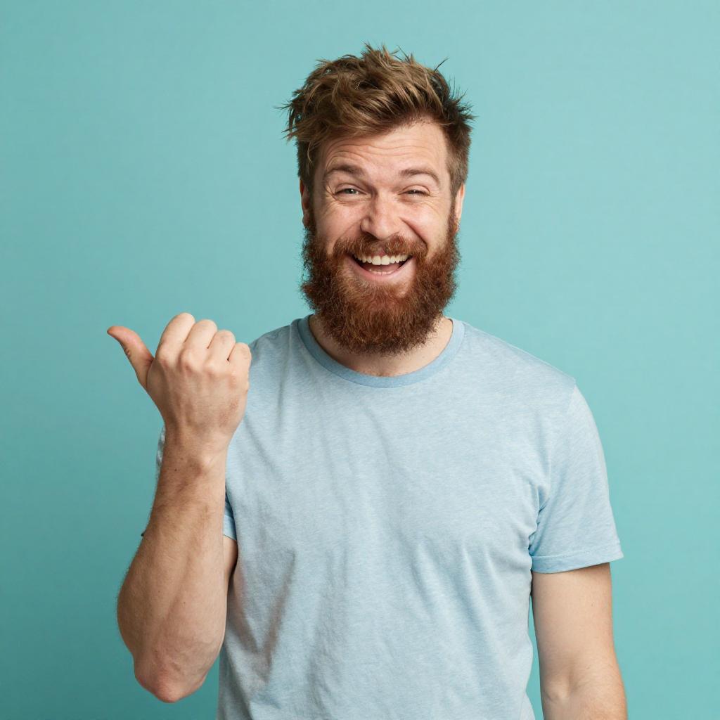 Photograph of a cute, bearded man with light brown hair, styled in a messy, spiky look. He's winking with his right eye and making a "hang loose" hand gesture with his left hand. He's wearing a light blue, short-sleeved t-shirt and standing against a solid turquoise background. His expression is playful and happy, with a wide, open-mouthed smile. The lighting is even, and the image has a bright, cheerful vibe.