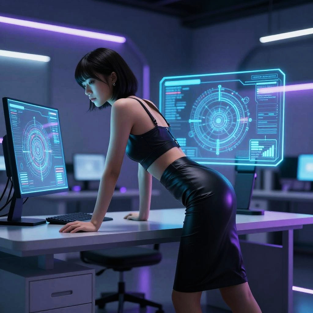Leaning on desk pose, futuristic workspace with holographic displays, person in sleek modern outfit, cool blue and purple lighting, sharp futuristic aesthetic, cinematic angle